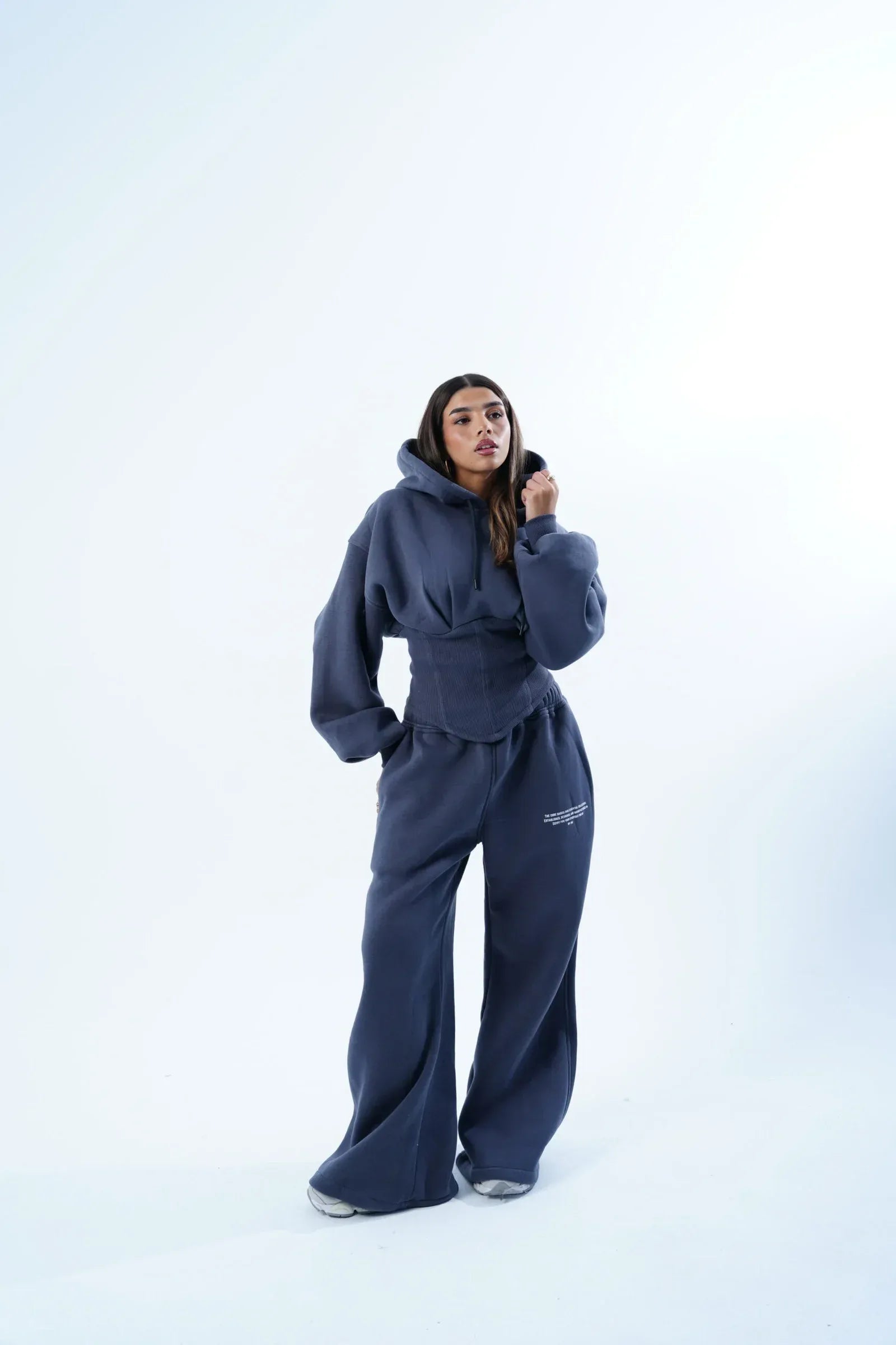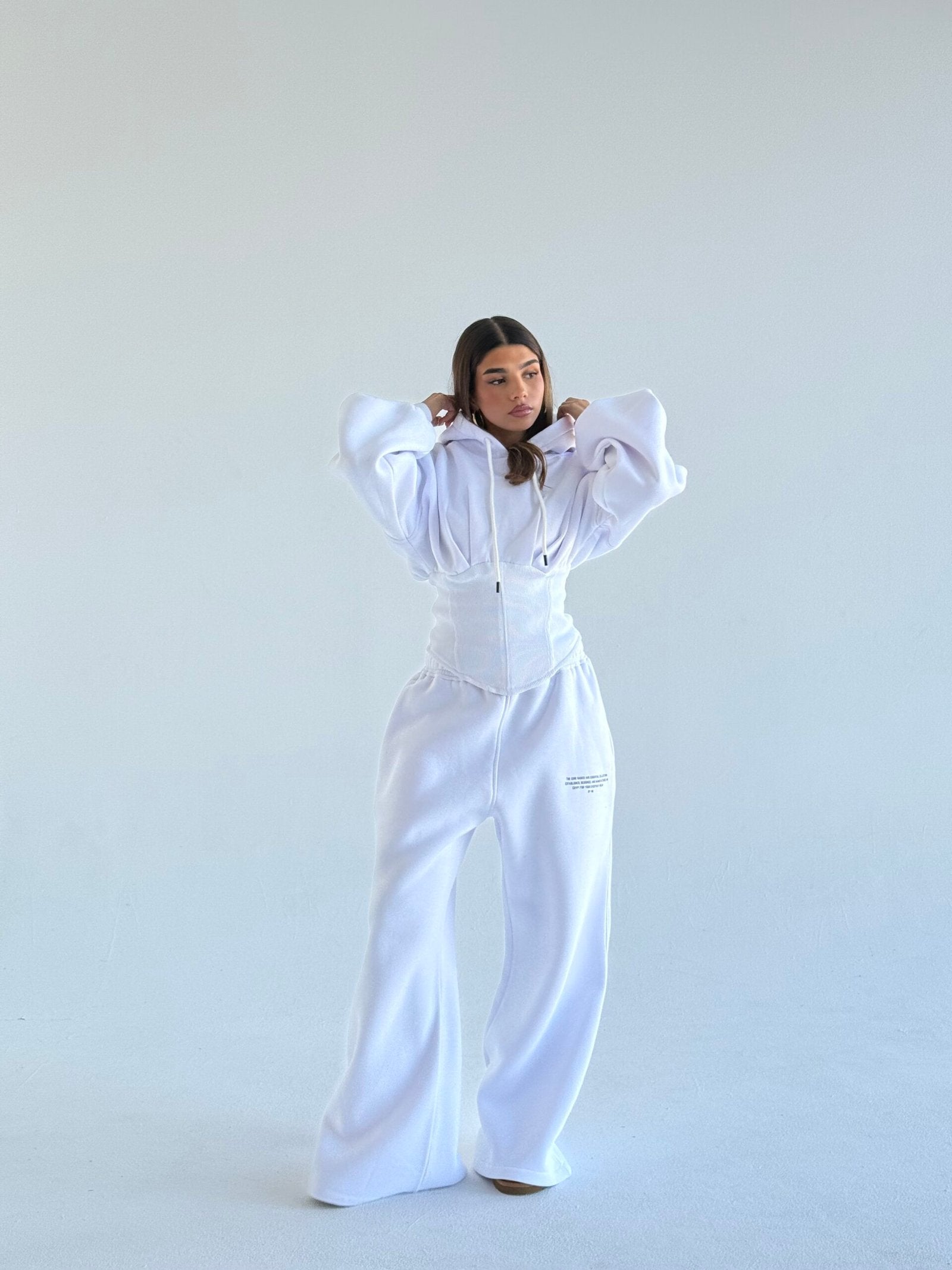 A coordinated set with a modern and sophisticated design, featuring a cropped hoodie paired with wide-leg pants. The hoodie showcases voluminous sleeves and an integrated corset-style structure that enhances the waist, creating an elegant contrast between comfort and a defined silhouette. The high-waisted pants elongate the figure, delivering a relaxed yet refined look.